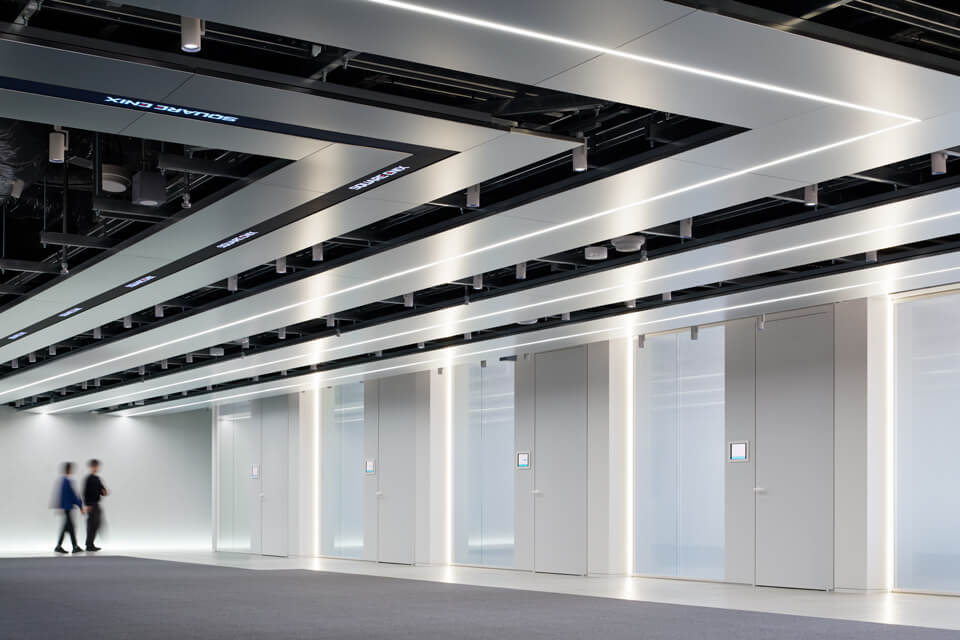 「スクウェア・エニックス渋谷オフィス」ゲーム開発に必要な電気容量を賄うため、天井には大量のケーブルが設置されている。ケーブルの配線もLED照明やサイネージとともに天井デザインの一部とした