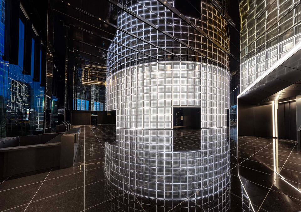 「渋谷サクラステージSHIBUYAタワーオフィスエントランス」(2025年6月号掲載)5階ロビーには円弧のアプローチ上に金属のメッシュウォールを設置。音と光の立体的な演出で渋谷らしさを表現