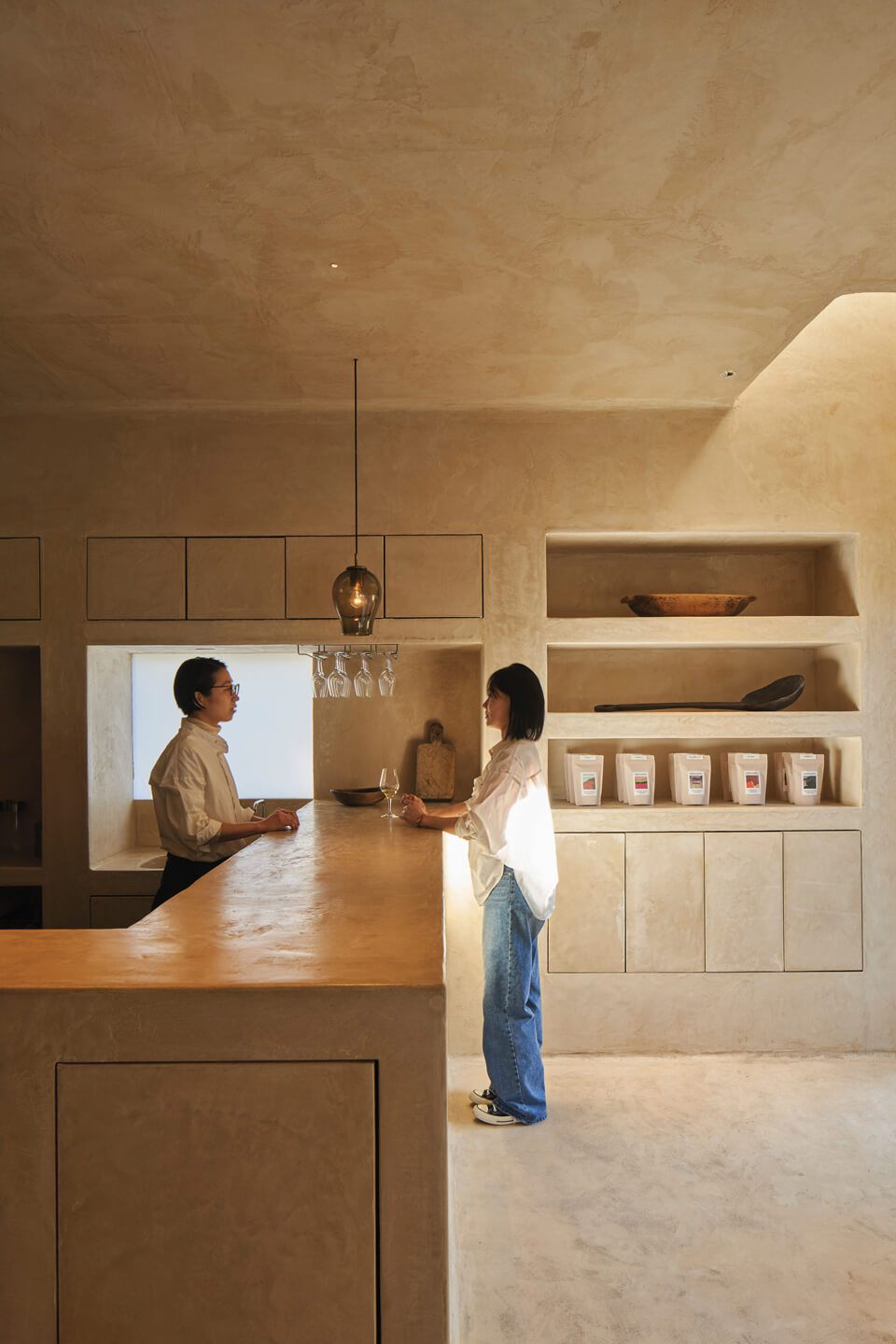 三筑遺跡のリサーチから着想を得た空間である「とどろき酒店」。洞窟のような曲面壁と土器のような質感を持ち、九州の土と無農薬の稲藁を練り込んだ左官で仕上げている