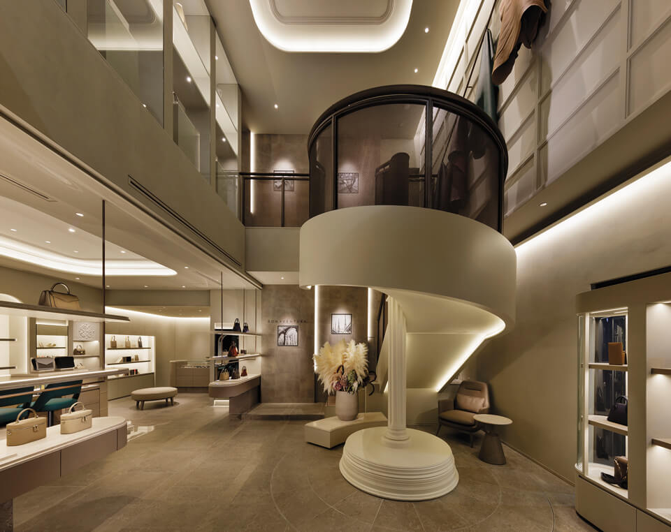 Old Kanが創業まもなく手掛けたのが、「BONAVENTURA(ボナベンチュラ)表参道店」。イタリア・ミラノ発のレザーグッズブランドの日本初出店で、コンペにより設計者として選ばれた。それを皮切りに同ブランドの国内外の複数店舗の内装を担当し、2023年には旗艦店「BONAVENTURA銀座店」(2025年5月号掲載)の設計を担った。テーマは「イタリアンモダン」で、印象的ならせん階段を中心に据え、モールディングやレリーフなど細部の意匠やマテリアルで、ヨーロッパのスタイルをさりげなく表現している。
