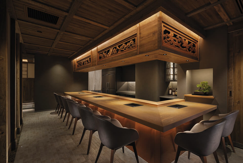 「焼肉神石西麻布店」。解体した古民家の欄間をカウンター上の下り壁に象徴的にはめ込み、竿縁天井や真壁風の壁材にも移築材を使用。時間を経た古材に金属材を組み合わせ、光の演出で上質さを生んでいる(施工:ヘンダーソン)