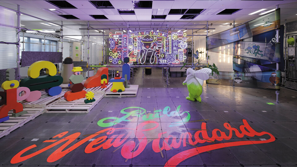 ユニオンテック自社オフィス。刺激的で楽しいオフィスを目指し、渋谷のカルチャーと企業カルチャーをミックスさせるよう、若手アーティストの作品を随所に取り入れた「ラボ」のような空間