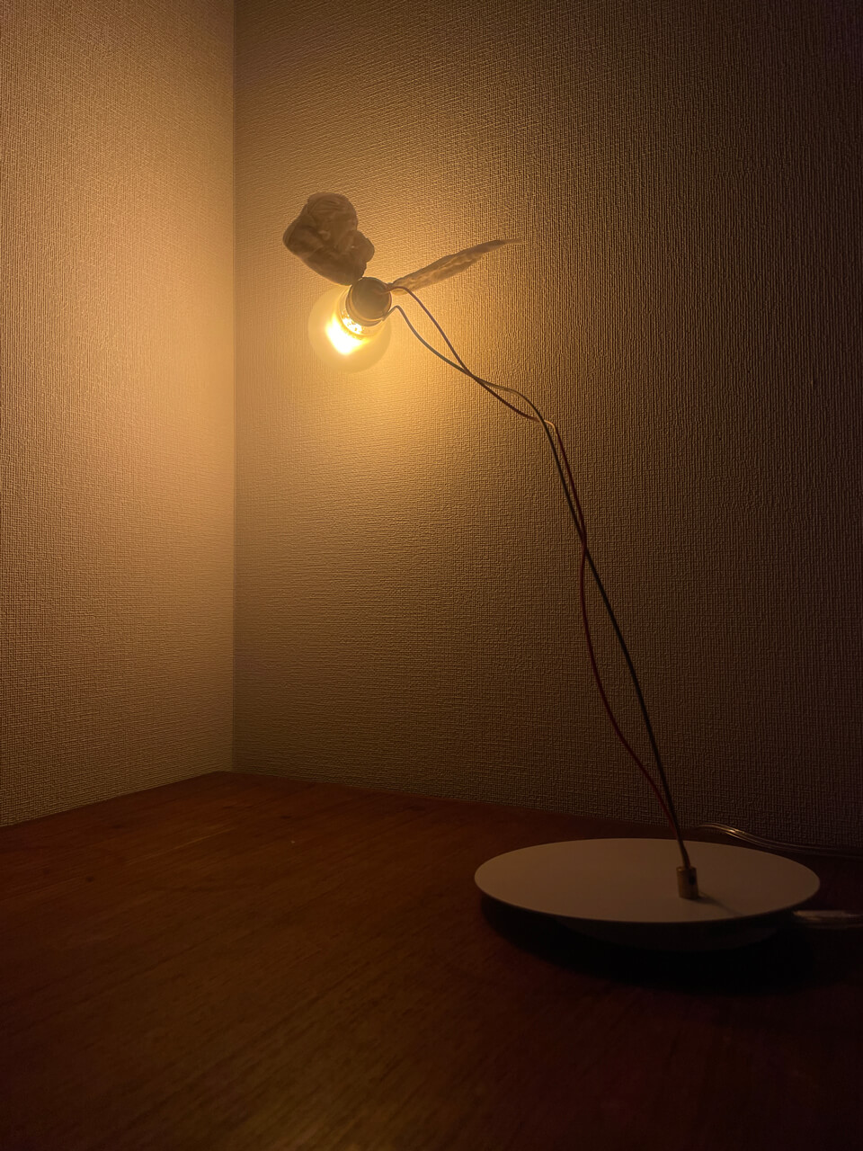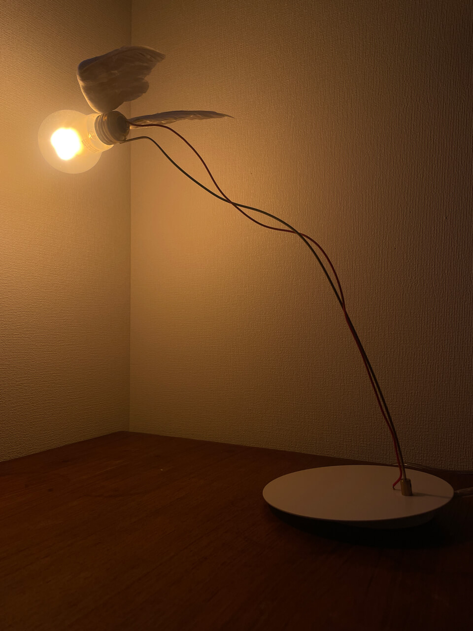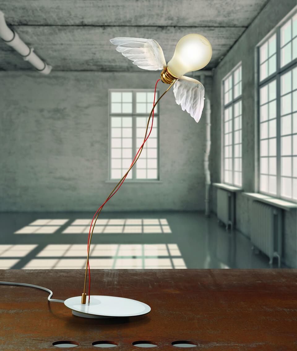 羽のついた電球のテーブルライト、INGO MAURERのアイコンの一つでもある「Lucellino Table」は、1992年当時ハロゲン光源の電球タイプで発表されました。2022年には、Lucellino専用に開発されたLED電球に替わり、変わらぬ美しい光を空間に灯し続けています。