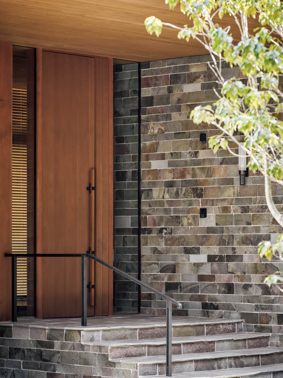 長野・軽井沢に立つセカンドハウス。天然石と木で構成したエントランスに、インターホン「Nasta Interphone 2」が調和する。写真のブラックのほか、ステンレスのポストや照明に合うシルバーも用意*