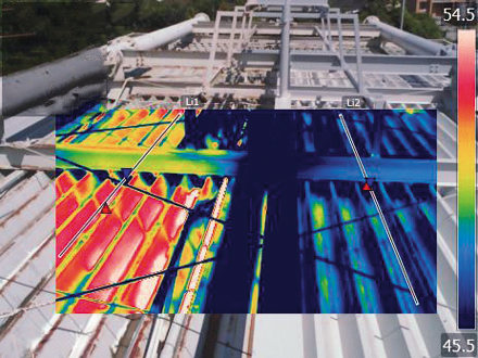 ガチエックス 大日化成 https://www.dainichikasei.co.jp/Tel. 06-6909-6755 大日化成の「ガチエックス」は、工場や物流センターなど各種施設における金属屋根用の水性塗膜防水工法。高い遮熱性能を誇り、屋根の温度上昇を抑えて冷房効率向上・CO₂排出量の削減を実現する。また、水性プライマーを選択すれば全工程で溶剤が不要になるため、施工中も匂いが発生せず施設運営を妨げない。防水塗膜は薄く軽量で、屋根や躯体への負担も少なく、長期に渡る耐久性をもたらす。写真は屋根表面の温度を視覚化したもの、左側が未施工、右側がガチエックス施工部。約10℃の差が確認できる。 資料請求する RELATED PRODUCTS 資料請求リストに追加 レティコロ